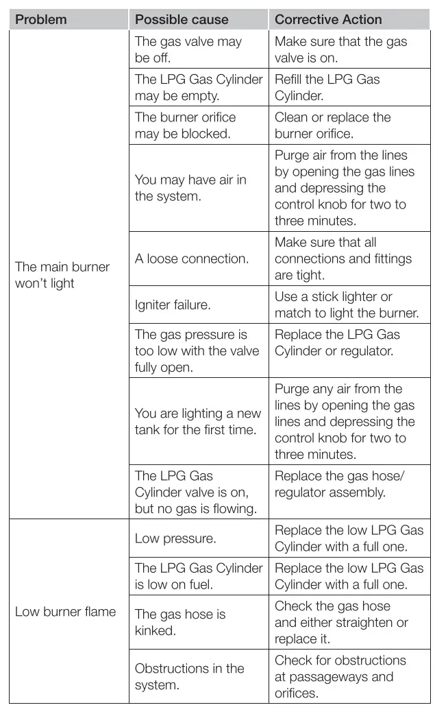 - Check the regulator and gas hose connections at least once per month and each time the LPG Gas Cylinder is changed. If they show signs of cracking, splitting or other deterioration, they should be replaced with a new regulator and gas hose of the same length (but not over 1.5m) and of equivalent quality, and according to National regulations.