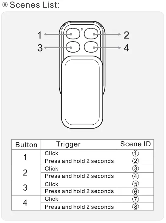 Every of the 4 action buttons can control 2 scenes. To use the primary scene single click on the button. To use the secondary scene press and hold the button for 2 seconds and release it. The numbering of the scenes (shown in the picture) is important to configure the scenes with your gateway.