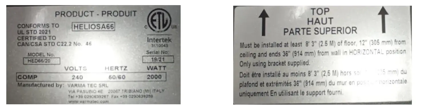 - Attention: If you install HELIOSA 66 in proximity of tents or awnings, please assure that recommended installation heights and clearance are respected and that the heater is not in direct contact with the tent or awning material.