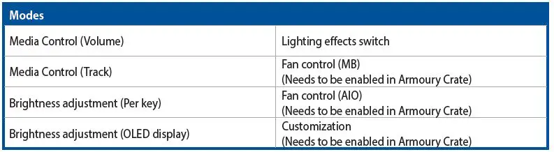 selected mode on the OLED display. You can then use the control knob to adjust the settings for each function ( O). Please refer to the table below for the diferent modes: