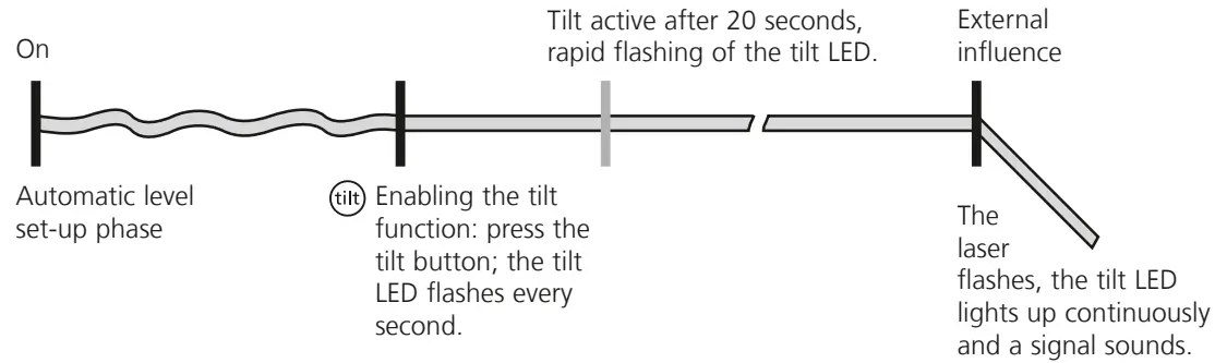 | The tilt function does not activate monitoring until 20 seconds after the laser has been fully levelled (set-up phase). The tilt LED flashes every second during the set-up phase, and flashes rapidly when tilt is active. |