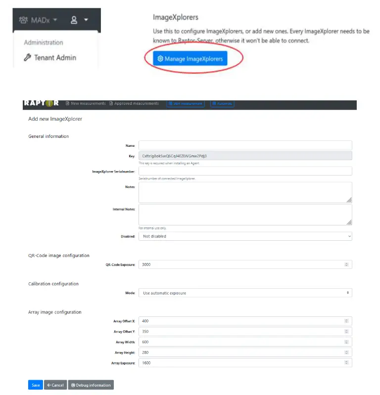The current ImageXplorer settings are to be found in the “Tenant Administration” area –>“Manage ImageXplorers” –> “Configure”. If the QR-Code is not recognized during the ConfigXplorer Scan, the standard “QR-Code Exposure” of 3.000 can be increased.