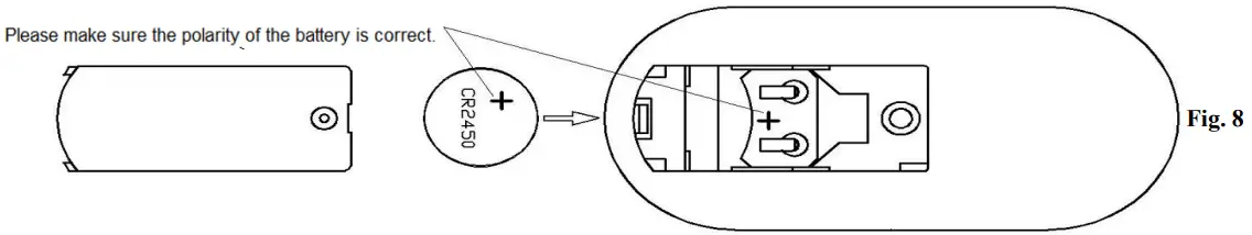 Install the 3V CR2450 DC battery into the remote. Please make sure the polarity of the battery is correct. (Fig. 8)