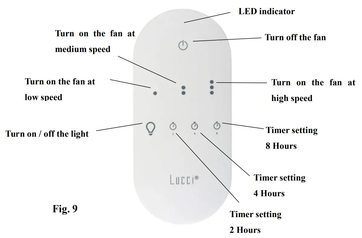 ” 8 hours timer button on the remote at the same time for 5 seconds and then release. During the process, the indicator light will flash slowly. - Turn ON the fan and change the speed of the ceiling fan via the remote to check the operation and successful paring.