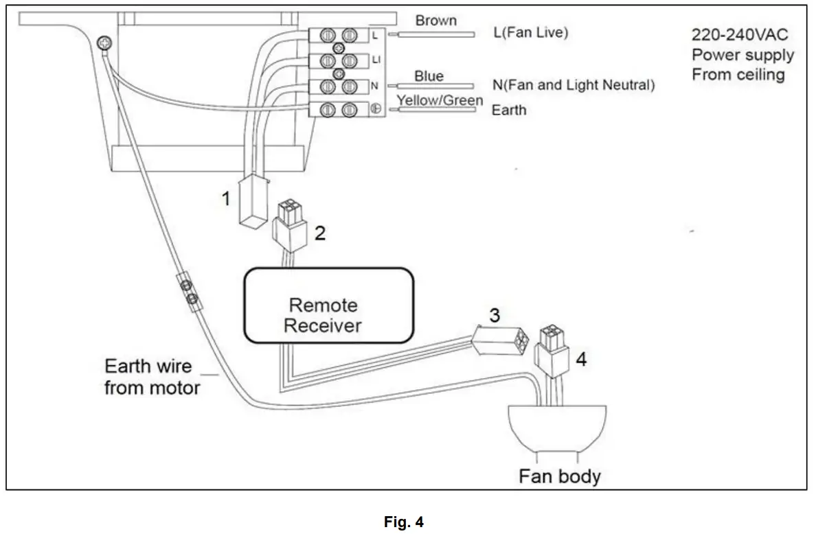 - Connect the remote receiver output (3) to ceiling fan body connector (4).