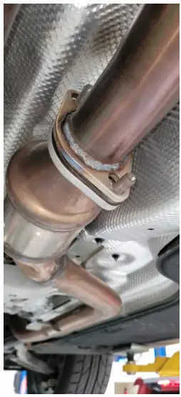- Install 2.5″ exhaust bandclamps onto slip connection; grab some aluminum foil and fold it up into a couple layers about 4″ wide and wrap around the slip fit connections, then install the clamps over top of the foil. This will aid in stopping exhaust leaks. Finally connect to catback exhaust using provided hardware.
