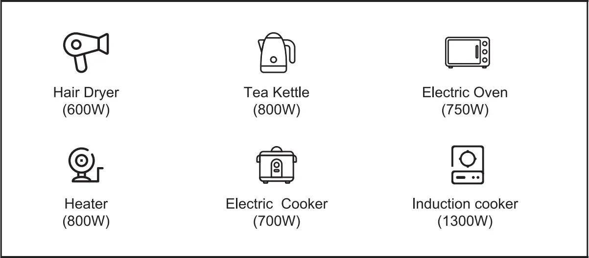 ![]() | Please power/charge the electric devices within the rated power of power station; The Watts/ Watt Hours of electric devices just for your reference. Please check the device’s user manual for the actual power Watts |