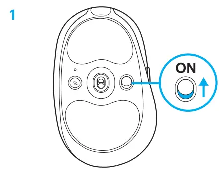 - Turn on the mouse by sliding the button up to reveal the blue indicator color.