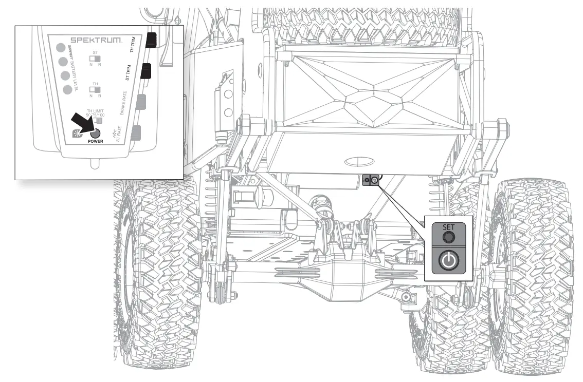 - With the vehicle on a flat surface, power ON the transmitter and then the vehicle. Wait 5 seconds for the ESC and AVC receiver to initialize.