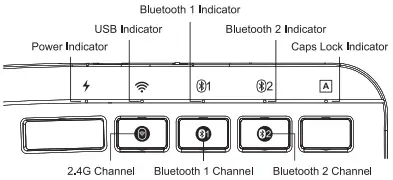 - Select Bluetooth 1, or Bluetooth 2 Channel by pressing Bluetooth 1, or Bluetooth 2 key, the corresponding Bluetooth Indicator will flash once, which means the keyboard enters into Bluetooth mode.