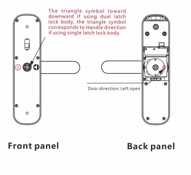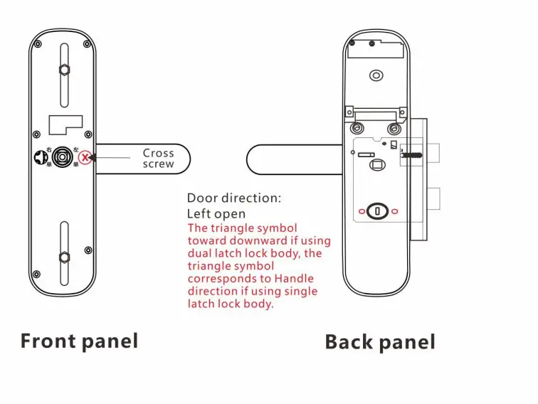 Stand outside of the door Adjust the direction of the handle and latch bolt accordingly to the opening direction when installing the door.