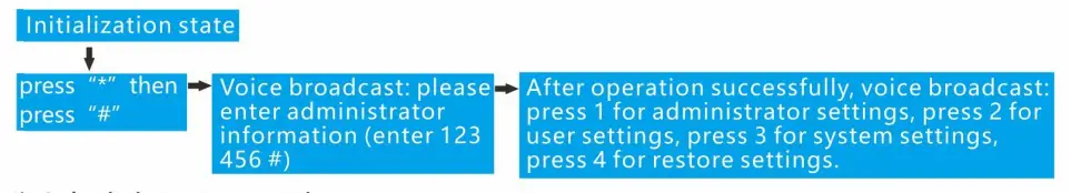 - Add administrator press “1” Add administrator press “1” , enter administrator information, input fingerprint or password(Fingerprint inputting 4 times, password input 6- 8 bit digital twice(888888#), IC card input once.