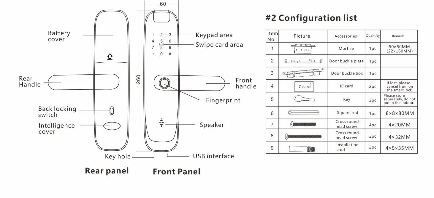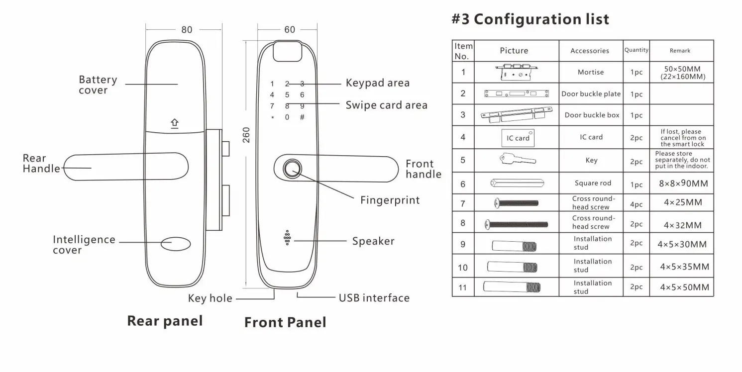 - Unlock methods: Fingerprint, IC card, Password, Key, WeChat Mini program, Tuya smart(Optional) Working current: > 250uA