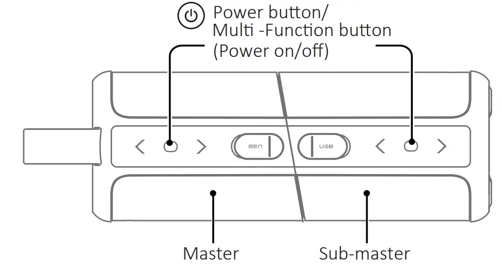 - Long press master and slave “O” simultaneously for 2S to power on. Then the speakers will be connected automatically with a beep sound and the indicator light of sub-master will keep blue, the master’s indicator will continue to blink.