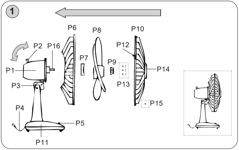 - Place the fan blade P8 onto the motor shaft P16.