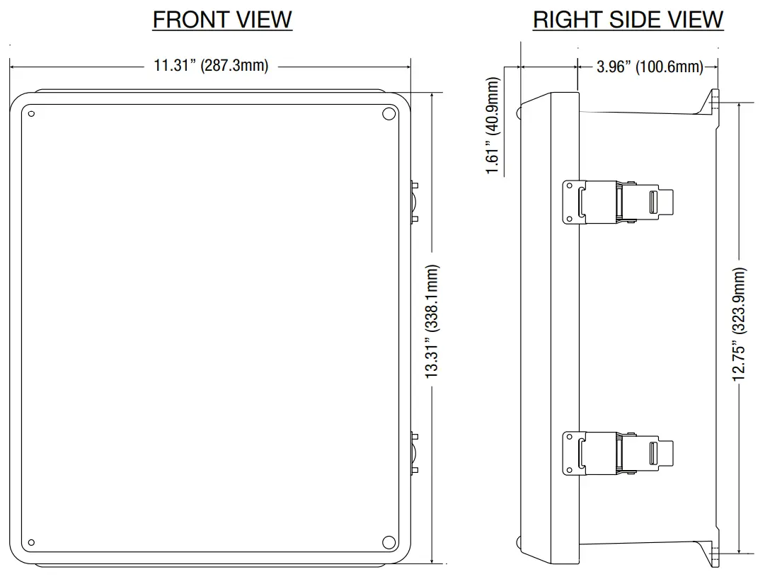 - Enclosure Dimensions (H x W x D approx.): 13.31” x 11.31” x 5.59” (338.1 mm x 287.3 mm x 142 mm).