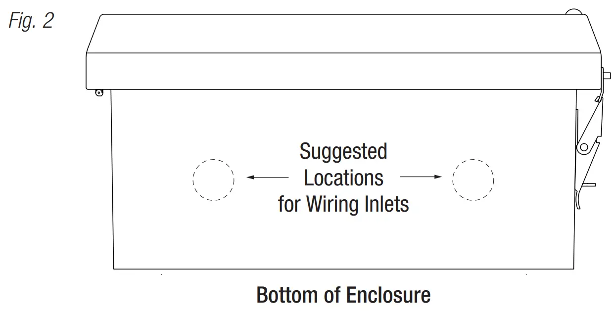 - Mark and drill desired inlets on the enclosure to facilitate wiring (Fig. 2, pg. 5).