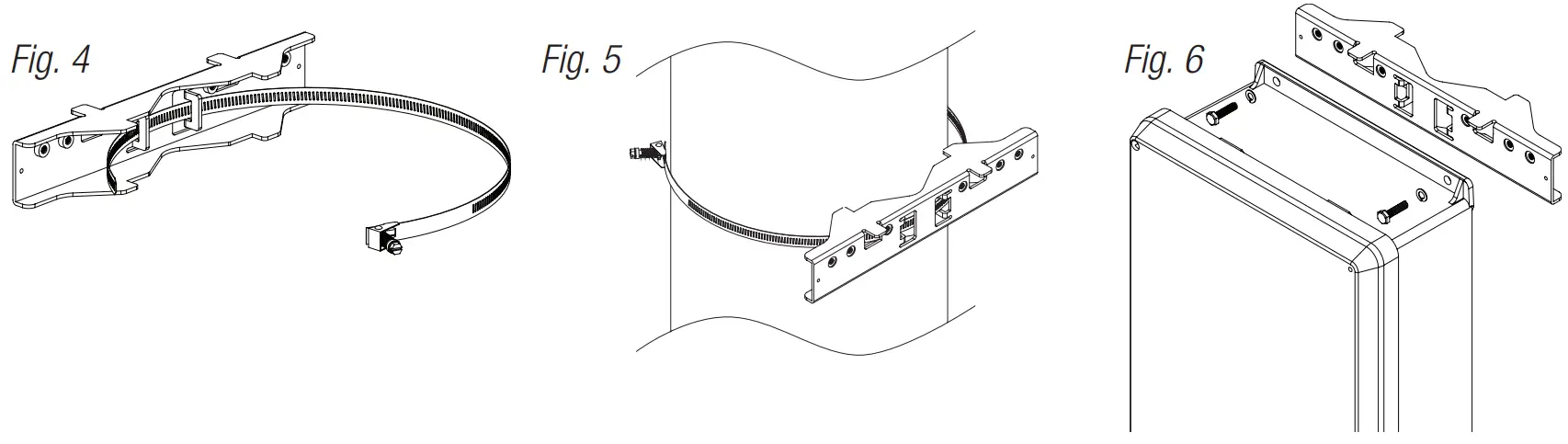 - Thread one (1) wormgear quick release strap through the slots on the back of a mounting bracket (Fig. 4, pg. 7).