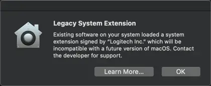 If you are using Logitech Options or Logitech Control Center (LCC) on macOS you may see a message that legacy system extensions signed by Logitech Inc. will be incompatible with future versions of macOS and recommending to contact the developer for support. Apple provides more information about this message here: About legacy system extensions.