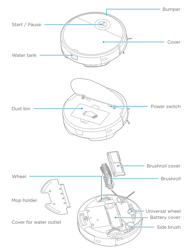 - Before charging, it is suggested to empty the water tank and remove the mopping pad and holder.