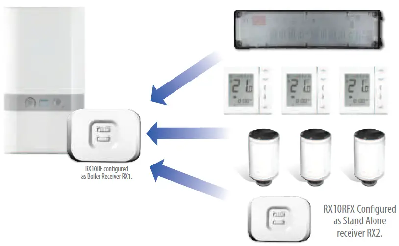 The RX10RF can be configured as remote boiler switch or a simple single channel output to control, a thermal actuator or zone valve. Please note the two configuratons above can be used together in the one system.