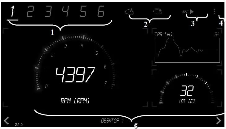EMUDash application support touch operation on screen. Allows to navigate between six different full customized desktops (1). Each desktop can display up to 6 parameters of the engine in three different types of gauges (analog, digital, graph) (5). It is possible to set different alarm values to each gauge. Application also inform about sensors failures, engine knocking (2). EMUDash also support LOG record for further log analysis in EMU windows client (3).