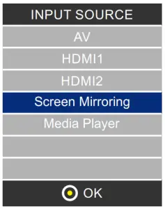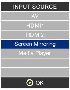 - Press “SOURCE” on remote control or push on projector, choose “Screen Mirroring” Loading time 5-10 seconds