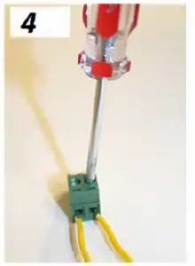 To connect the boundary wire into your transmitter, locate the 2 holed block in the bottom of the transmitter (above 1 ), remove the green block (above 2), strip back the yelow plastic to expose the copper wire of each wire (above 3). Insert both copper ends and tighten screws with Flathead screwdriver (above 4). Finally, put the complete wired up block back into the original position in the transmitter (above 5).