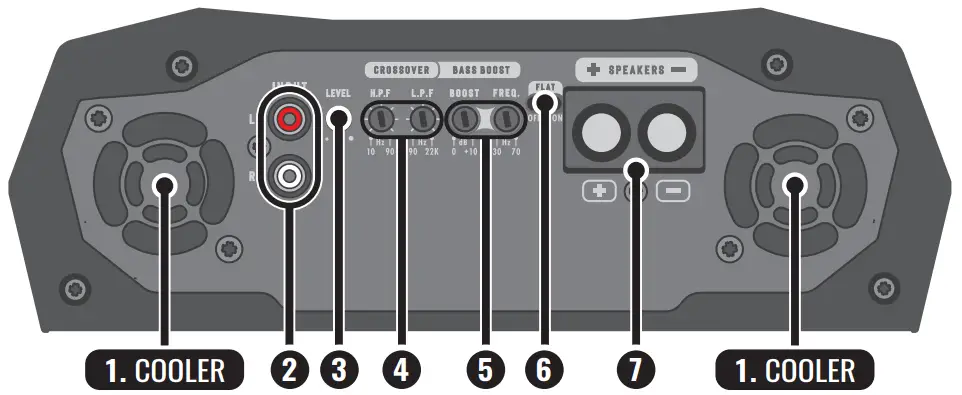 ▪ FREQ: Variable control for BASS boost frequency from 30Hz ~ 70Hz. - FLAT KEY: This switch allows you to turn the FLAT mode on or Settings made on the CROSSOVER and BOOST controls will be turned off when using this mode.