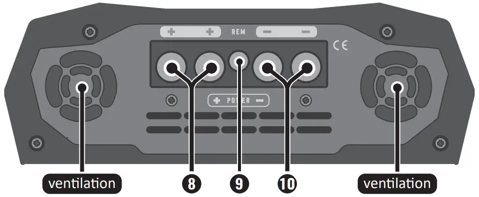 9. REMOTE CONNECTOR (REM): Allows automatic activation of the amplifier when turning on the radio/player. Connect to the remote output of the radio/player using a cable a minimum of 18 AWG.
