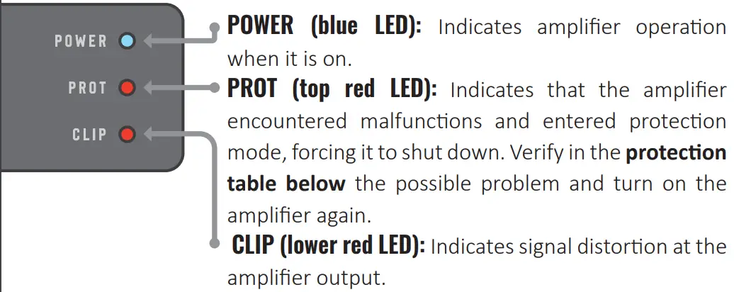When the protection system detects a failure, the amplifier will turn off and the PROT LED will blink. For each type of failure, the LED will flash a certain number of times indicating the cause, as shown in the table below: