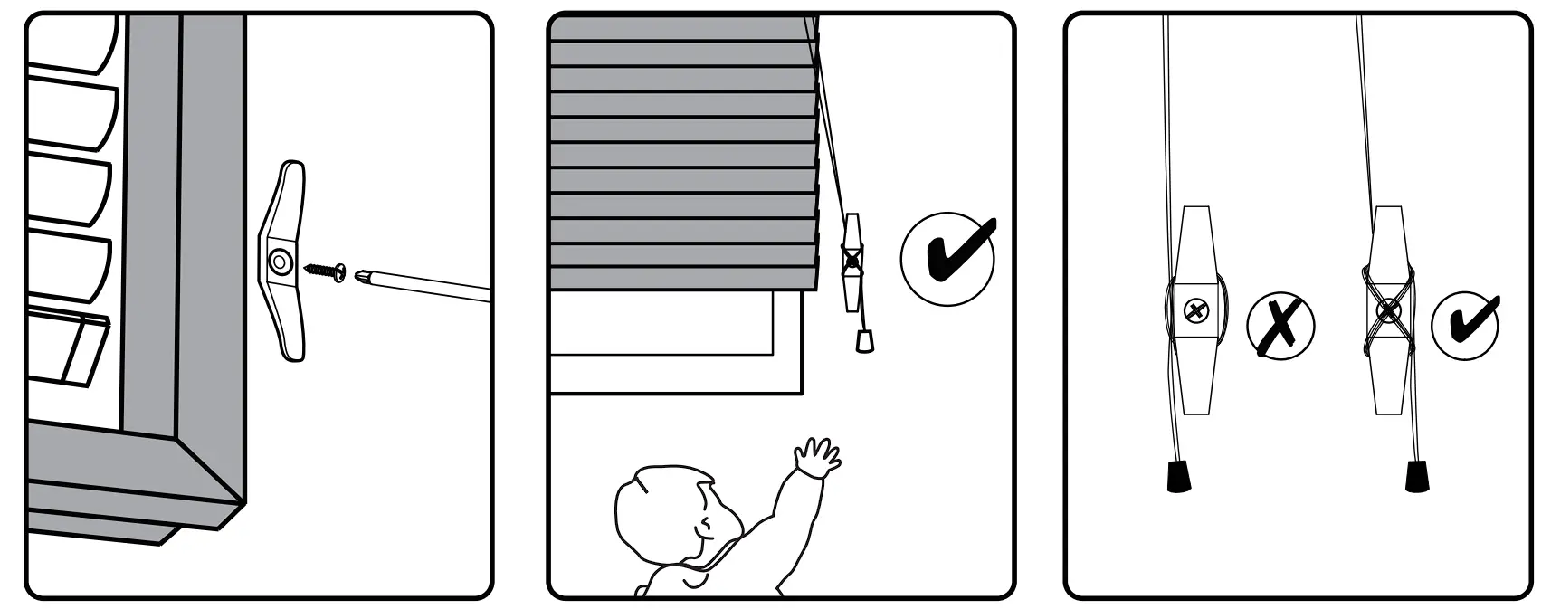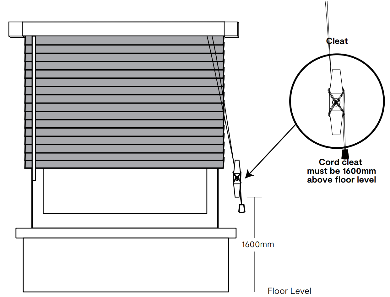 | WARNING: To avoid creating a possible strangulation hazard for children, the corded internal window covering must be installed in such a way that a loose cord cannot form a loop 220mm or longer, at a height of less than 1600mm above floor level; SUGGESTIONS FOR INSTALLING CORDED INTERNAL WINDOW COVERINGS: i) A cord guide may be installed lower than 1600mm above floor level if the *cord is sufficiently secured or tensioned to prevent a loop 220mm or longer from being formed; and ii) If a cord guide is installed lower than 1600mm above floor level it must be designed to prevent a child from being able to remove the cord; and ii) lf a *cleat is used to secure the cord it must be at least 1600mm above floor level because a child is capable of unwinding a cord from a cleat. *cord: rope, strap, string, chain, line or wire used to manipulate a corded internal window covering. |