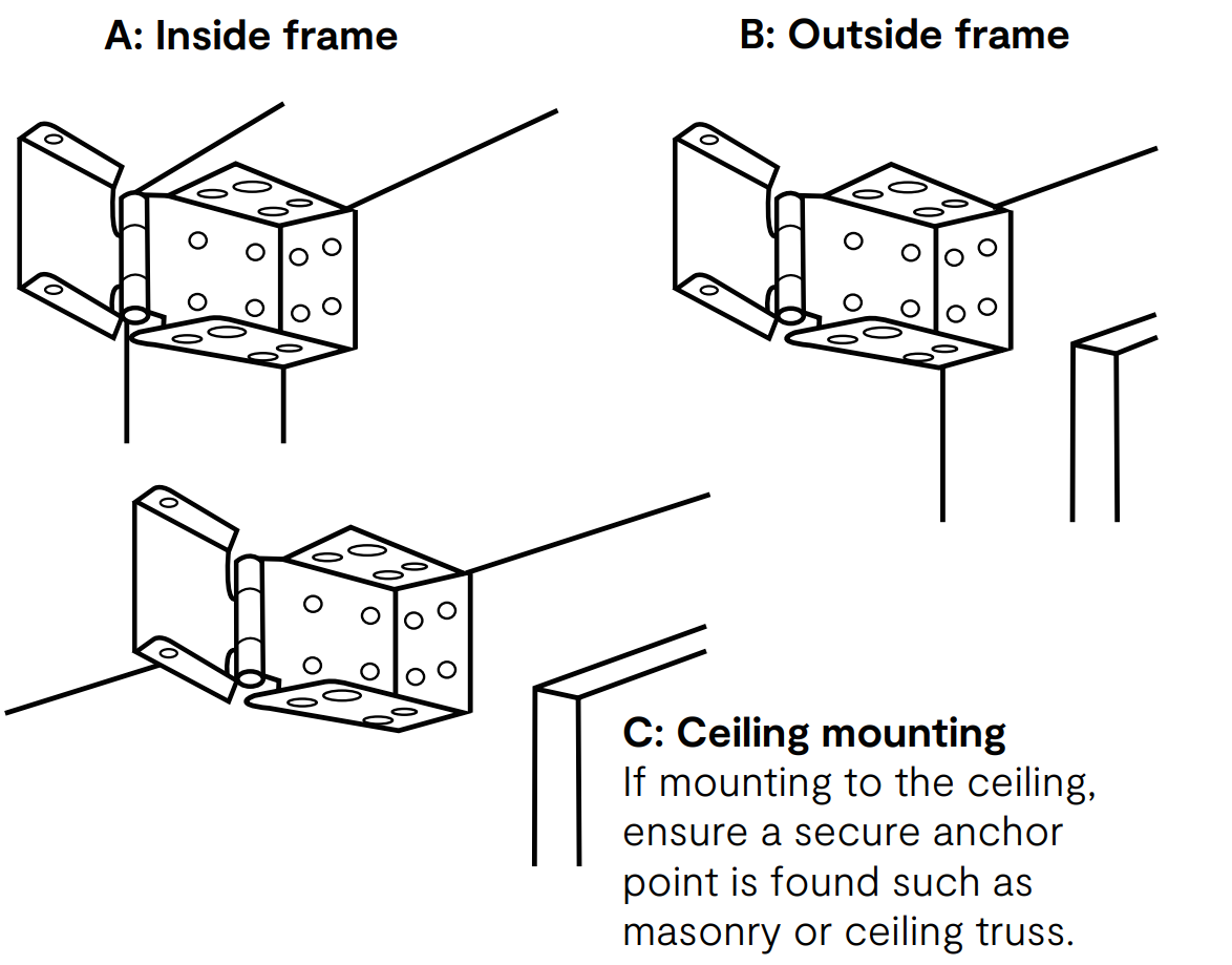 - The cleat provided should be fixes to a timber frame, masonry or stud behind plaster wall ensuring that the cord is taut at all times. The cleat must be installed a minimum of 1600mm above floor level.