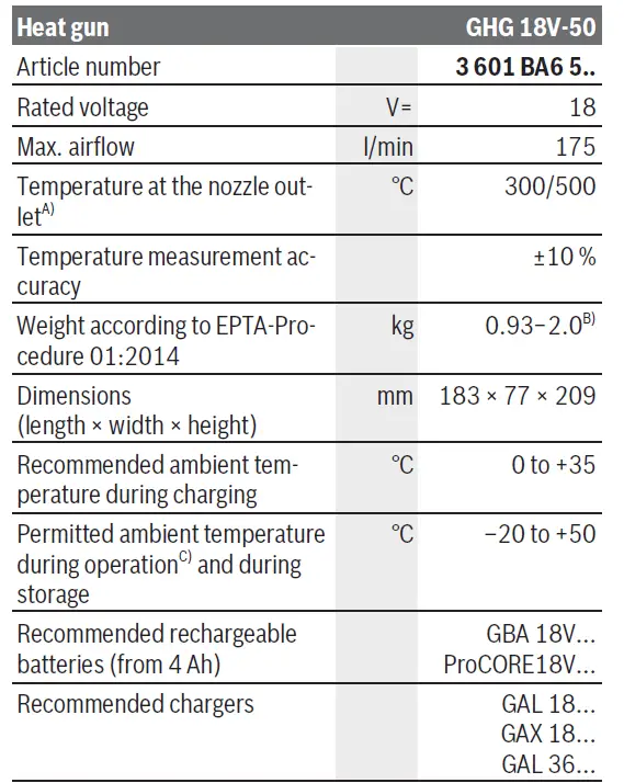 The heat gun is compatible with all available 18 V Bosch Pro-fessional rechargeable batteries. When operating the heat gun with rechargeable batteries smaller than the recommended 4 Ah, however, the heat gun will not reach full power at the 500 °C setting (the temperat-ure is not reached and the air volume is reduced). In order to show that the heat gun is working only with reduced output, the LED worklight (6) flashes slowly several times upon switching on.