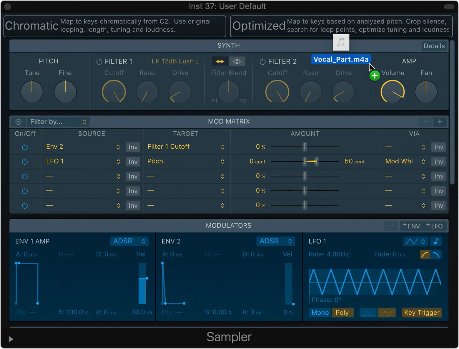 You can process your entire instrument using Sampler’s powerful built-in synthesizer, mod matrix, and modulators.