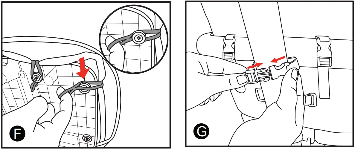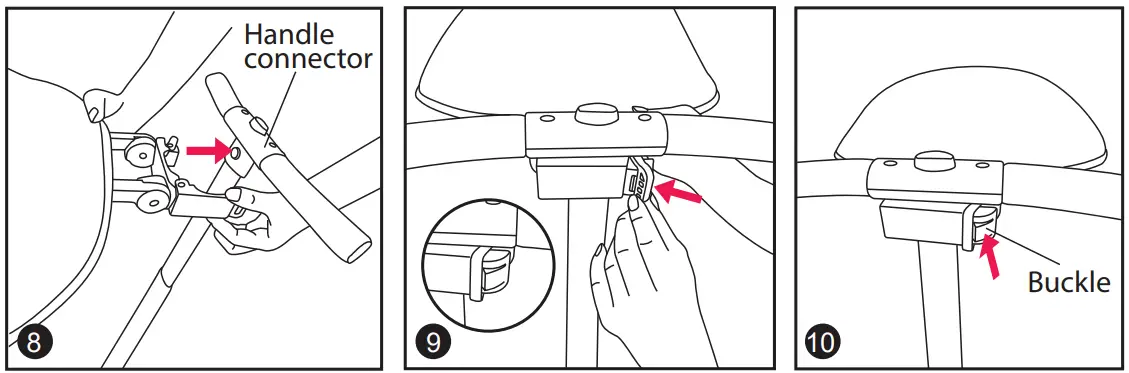 (8) Attach the back of the seat onto the handle of the rider using the buckle as shown in figure G and H.