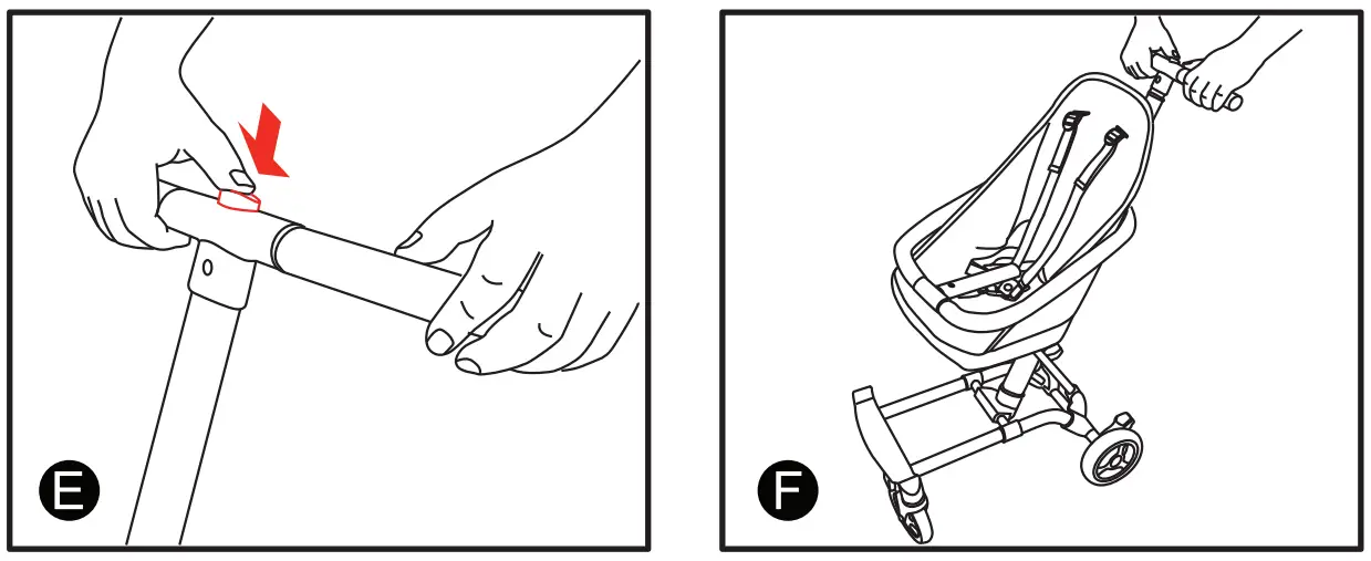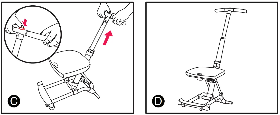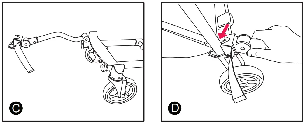 (2) Lift up the handle of the stroller until it clicks into place. Before continuing with the rest of the steps, make sure that the stroller handle is locked into place (figures C and D).