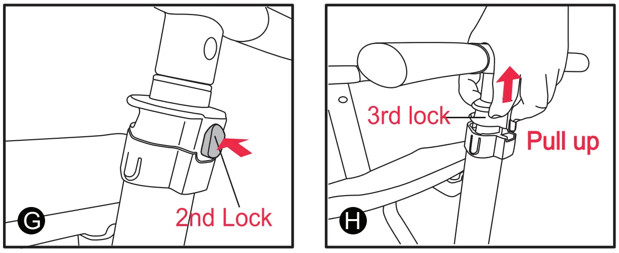 ( 12) Press the 2nd lock and pull up on the 3rd lock as shown in figures G and H.