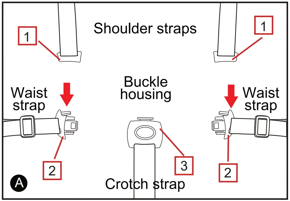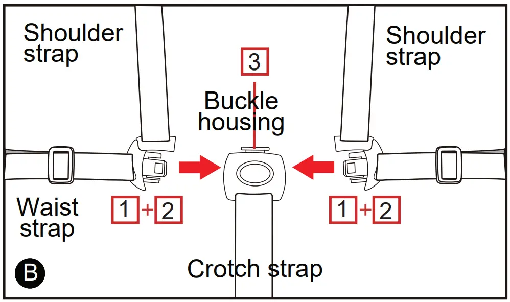 A five point harness is provided to restrain your child. Buckle tongues separate for added safety. To reconnect buckle tongues and to secure the child in the harness, please follow the steps below carefully.
