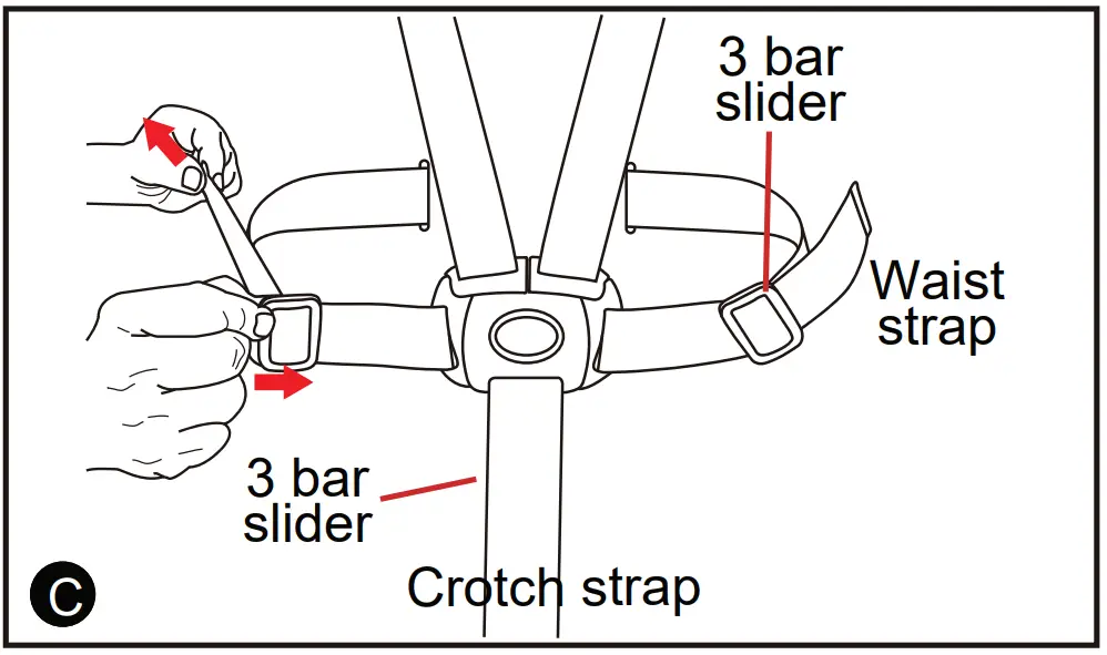(16) You can tighten or loosen the crotch straps by sliding the bar sliders.