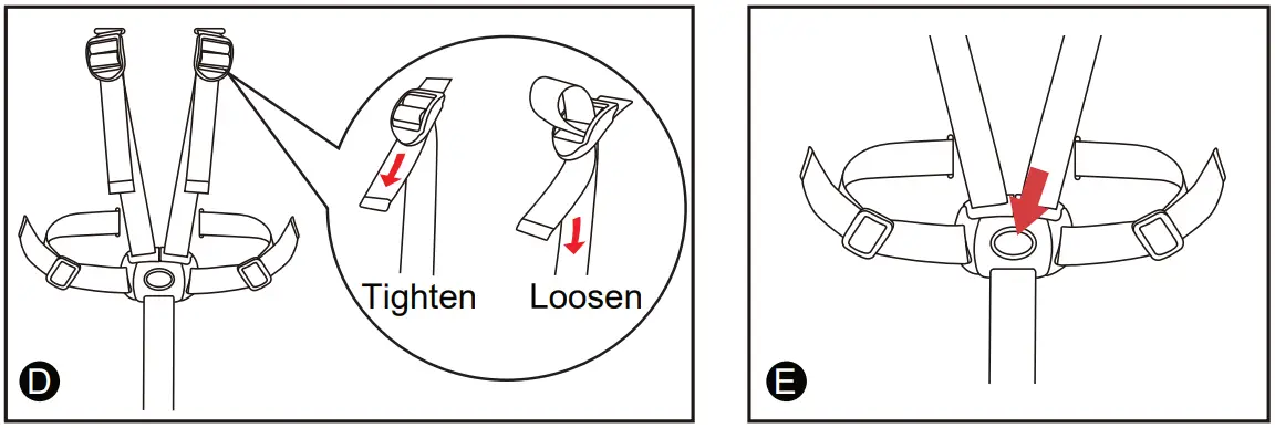 (17) To tighten or loosen the shoulder strap, hold and lift the slider and then pull the harness strap, to adjust to the desired fit. The waist strap and harness needs to fit firmly around child. (18) To release the buckle from the buckle housing, squeeze the button on the buckle housing (Fig. E).