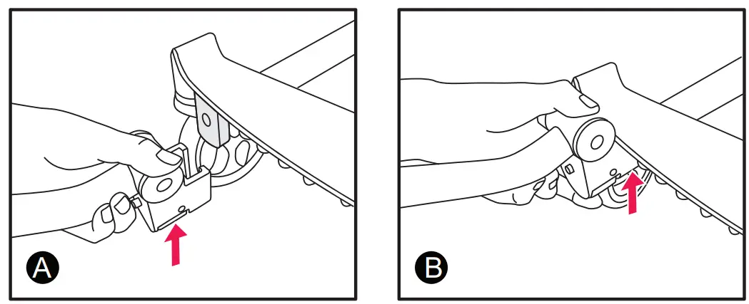 (1) Press the quick release button on the connector to connect it to the rider as shown in figure A/B/C. To detach the connector, press the quick release button to remove it.