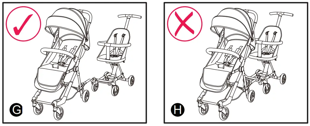 When using the connector on the left rear leg of your baby stroller, connect it to the right front leg of your Coast Rider, and vice versa. Refer to Figures G/H.