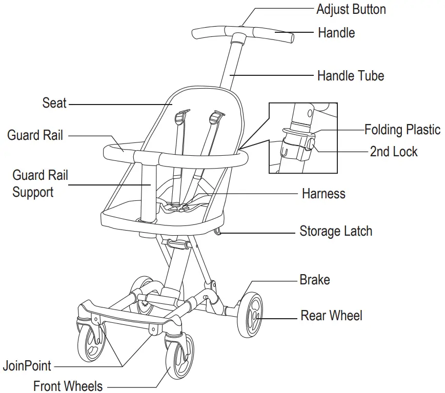 - Never leave your child unattended in the Stroller/Rider. Five point safety harness should be kept on at all times when a baby/child is in the stroller/Rider. Never hang a shopping bag, purse, diaper bag or any other bag to the handle of the Stroller/Rider. Additional weight on the handle could tip the stroller or a baby/child could get entangled by a strap causing suffocation or injury. Please follow all safety protocols while using this product.