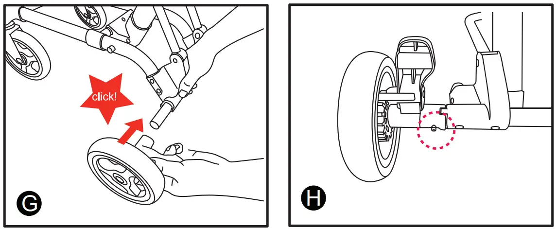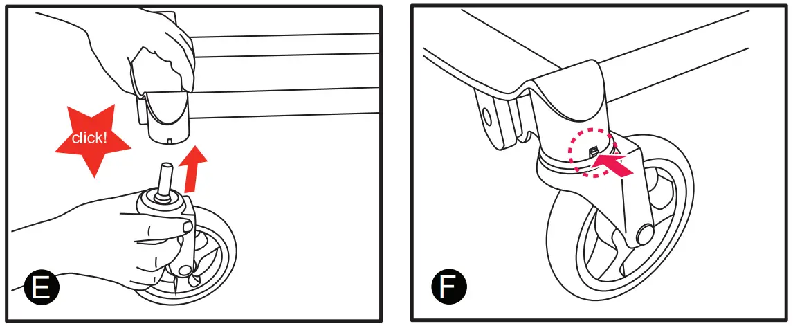 Slide each Front wheel into the mounting post in the front of the stroller until they click into place (figure E and F). Make sure that the wheel is secure and locked into place by tugging on it (figure E).