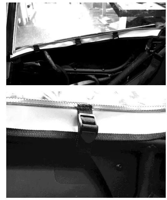 - Now move around the door and attach the remaining Velcro strips in the same manner. Down the front of the door place the edge of the door against the side of the windshield and run the Velcro strips under it with the 3” adhesive Velcro on the inside of the roll cage.