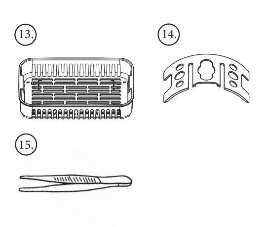 - Glasses and spectacle frames (avoid direct contact between the spectacle glasses and the bottom of the reservoir to prevent scratching. Use the basket with the glasses facing up). Pay attention to any loose pieces or any damage to the coating of the frame or to the glass. In this case, the coating may be further damaged during the cleaning process.