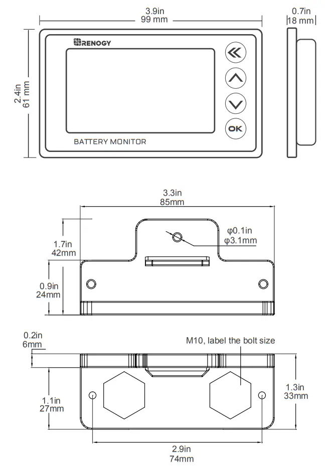 The Renogy Battery Monitor is fixed by tabs, so it is easy to install. First, open a rectangular orifice on your equipment panel according to the size. Then put The Renogy Battery Monitor into the rectangular orifice, and make sure the tabs are locked.