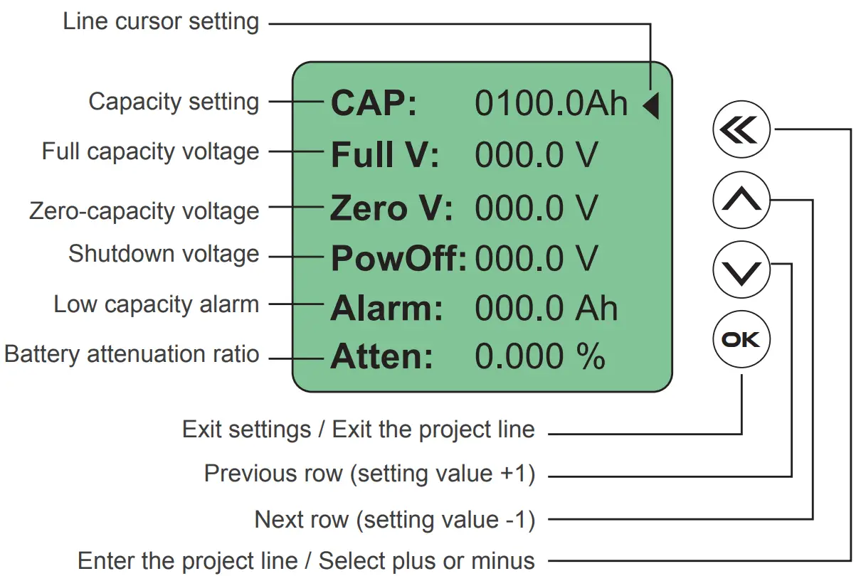 Zero capacity voltage: The capacity value is automatically set to 0% if below this voltage. The voltage value will flash, and the buzzer will alarm once per 10s if the discharge continues.