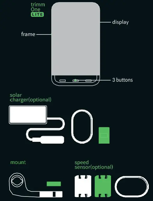 The trimming LITE package consists of a trimming LITE body, a mount, a charger cable, a solar speed sensor(optional), and a solar charger(optional).